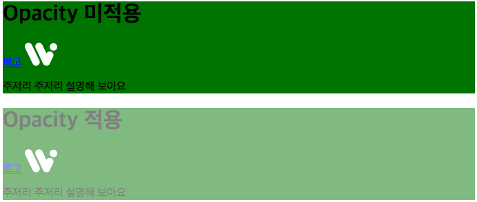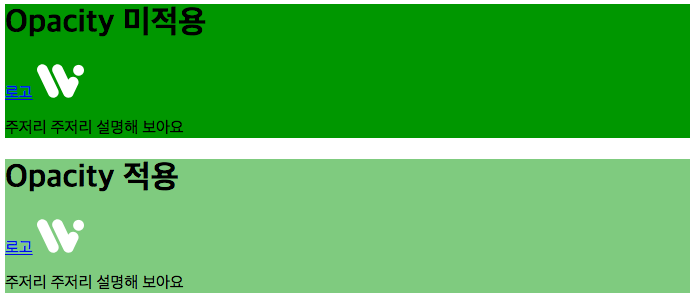 <style> #opacity_no { background:green; } #opacity_test { background:green; opacity:0.5; } </style> <div id=“background”> <div id=“opacity_no”> <h1>나는 제목</h1> <a href=“logo.png”>로고</a> <img src="http://webi.kr/img/logo.svg"> <p>주저리 주저리 설명해 보아요</p> </div> <div id=“opacity_test”> <h1>나는 제목</h1> <a href=“logo.png”>로고</a> <img src="http://webi.kr/img/logo.svg"> <p>주저리 주저리 설명해 보아요</p> </div> </div>