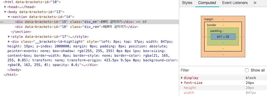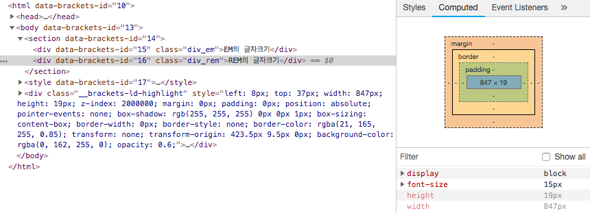 숫자를 더 크게 지정한 rem이 더 작아진거죠? 개발자 도구로 font-size가 어떻게 설정되었는지 확인해 보겠습니다.