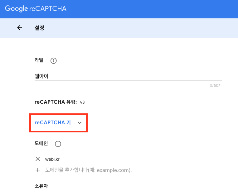 reCaptcha 유형 : 원하는 방식의 reCaptcha를 선택합니다. 저는 v3를 이용하겠습니다.