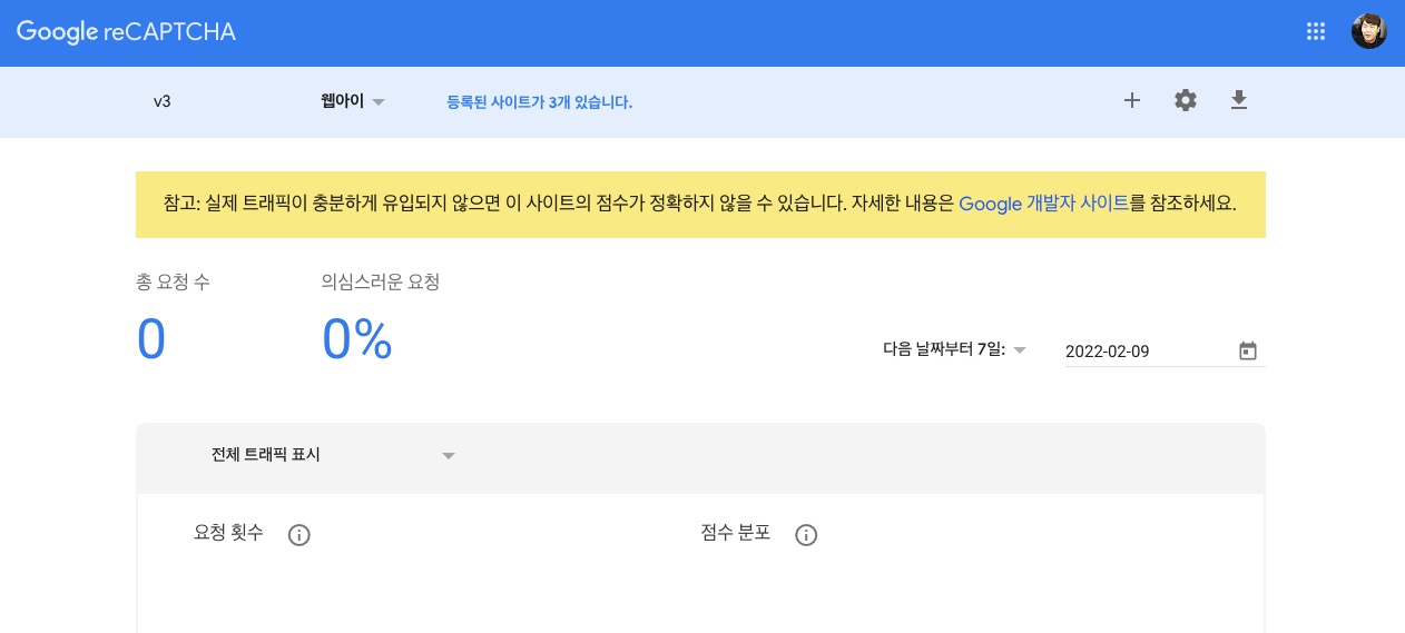 reCaptcha 신청이 완료되고 메인 대시보드 화면으로 돌아오면 총 요청 수와 의심스러운 요청이 몇 건이 있었는지 통계를 확인할 수 있습니다.