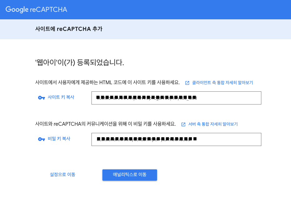 서비스 신청이 완료되면, 위와 같이 사이트 키와 비밀키를 받을 수 있습니다.
