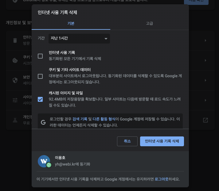 (인터넷 사용 기록, 쿠키 및 기타 사이트 데이터는 체크하시면 브라이저 이용 기록이 삭제 됩니다.)