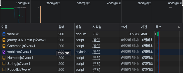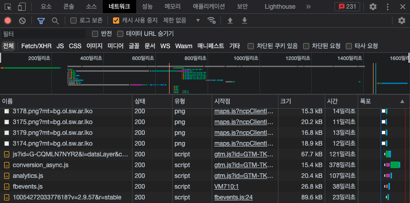 브라우저의 개발자 도구를 통해 확인해보면 캐시된 파일들을 확인 할 수 있습니다.