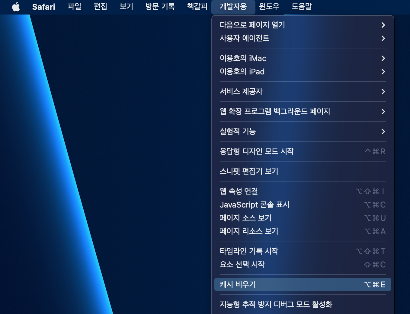 사파리에서 캐시를 지우려면 개발자 도구 메뉴를 활성화 해야합니다.