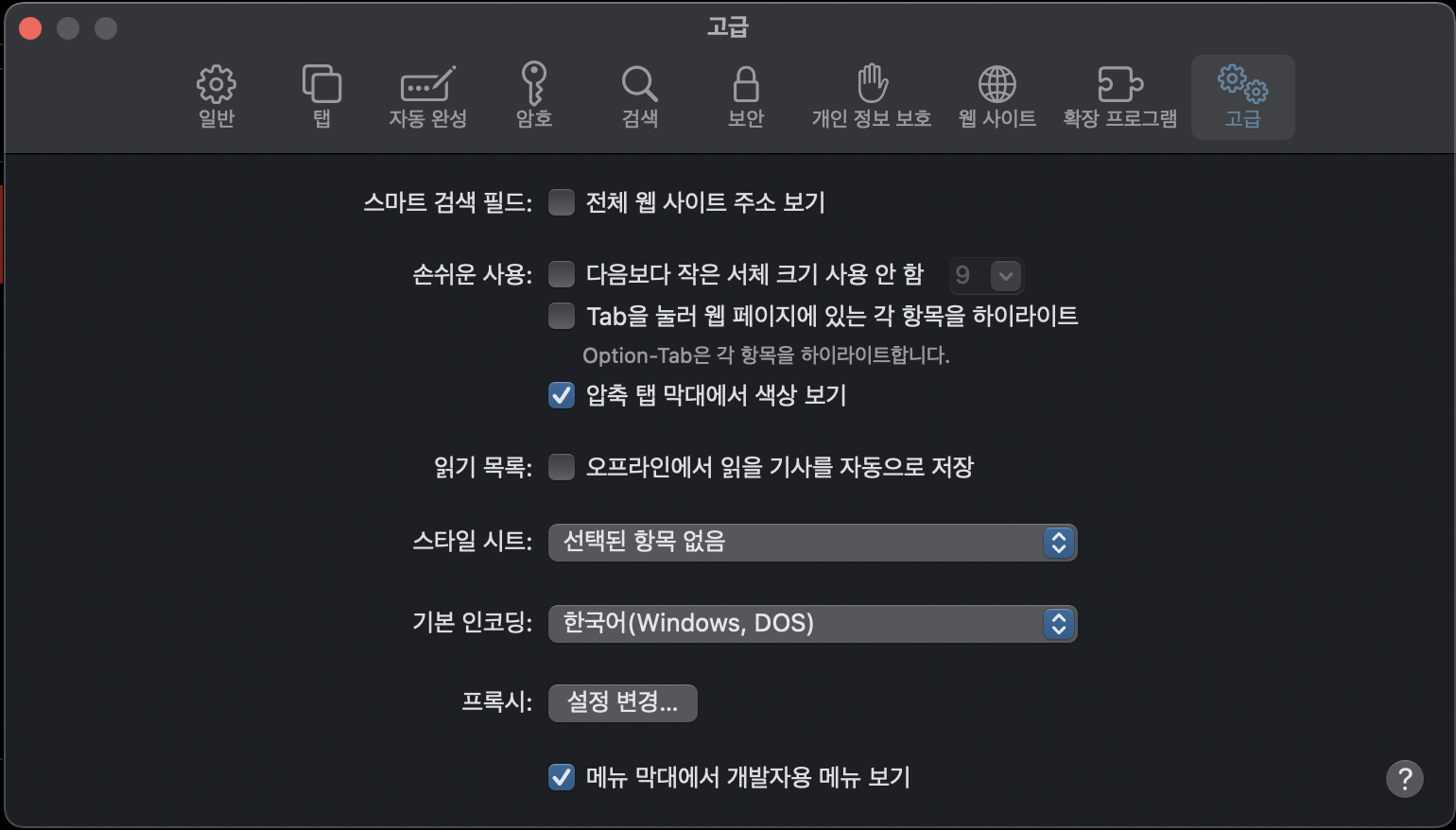 - 하단의 메뉴 막대에서 개발자용 메뉴 보기를 체크하고 창을 닫아줍니다.